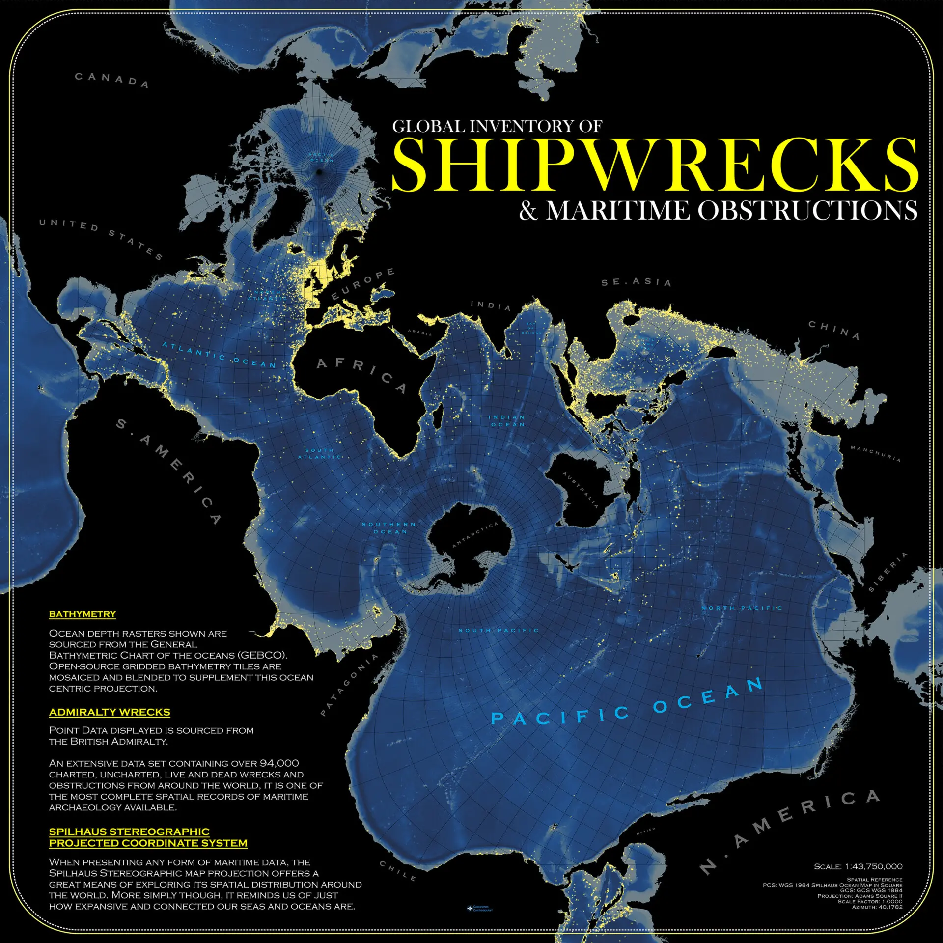 This map from Scott McCune shows shipwrecks and maritime obstructions around Earth’s oceans. It includes more than 94,000 records cataloged by the British Admiralty.