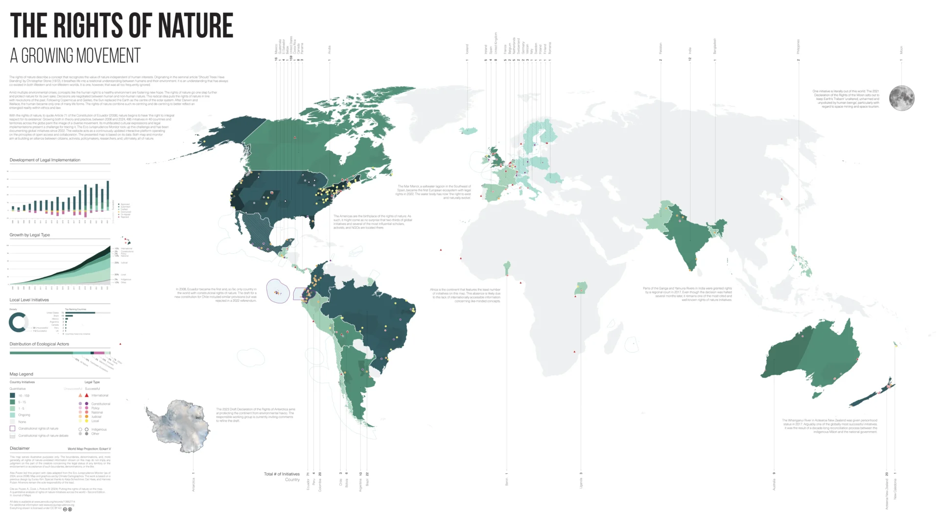 Recent cartography by Alex Putzer, John Cook, and Ben Pollock puts the movement on the map. Several charts provide a timeline of proposed, accepted, rejected, and overturned proposals. Most implementations (30 percent) have been at the local level, while 15 percent are international. Just two percent of these initiatives are indigenous, and another two percent exist within the constitutions of countries. The United States leads the way with 72 initiates, followed by Brazil who recognizes 18 such projects. Most proposals cover “all of nature,” while a focus on marine and freshwater accounts for 21 percent of proposals. Another 10 percent goes to animals. Data for this map comes from the Eco Jurisprudence Monitor, and the visuals were developed by Climate Cartographics.