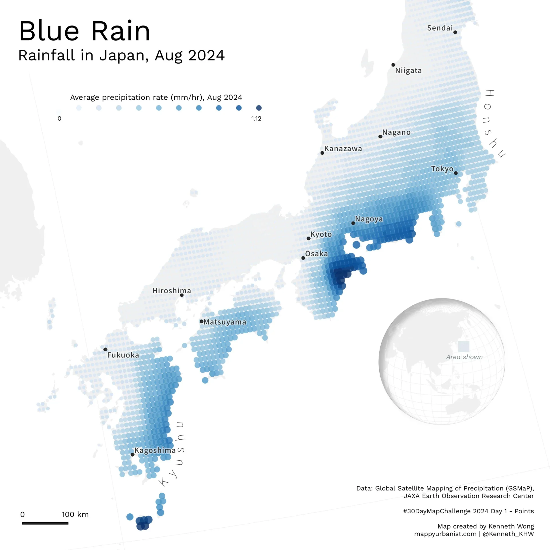 This beautiful pair of maps from Kenneth Wong demonstrates this relationship. They use data from the Japan Aerospace Exploration Agency (JAXA) to explore nighttime temperatures and rainfall rates in August 2024.