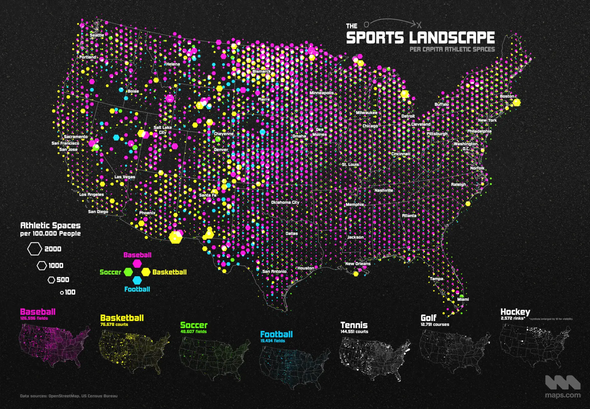 One way to answer these questions is to simply map the spaces where various sports take place. You could map every baseball, football, and soccer field. Then map every basketball court. And add to it every tennis court, golf course, and hockey rink. That’s exactly what we did. But we didn’t stop at merely mapping the locations of these spaces. Doing so would by and large reveal different variations of a population map: where there are more people, there are likely to be more athletic spaces of any kind.