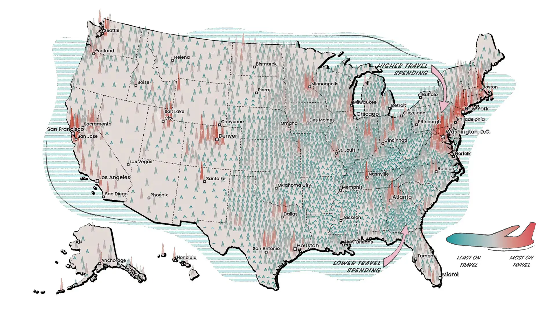 The first map provides an overview of travel spending in the US. Taller, orange spikes show counties where households spent more money on travel while. Counties with shorter teal spikes spend less. This map reflects the patterns we typically observe in median household income trends. Counties in or near metro areas spend more than their more rural counterparts. There are some notable outliers, though, such as northwestern North Dakota and northwestern Wyoming. The northeast corridor from Washington, DC, to Boston, Massachusetts, is a hot spot for travel spending.