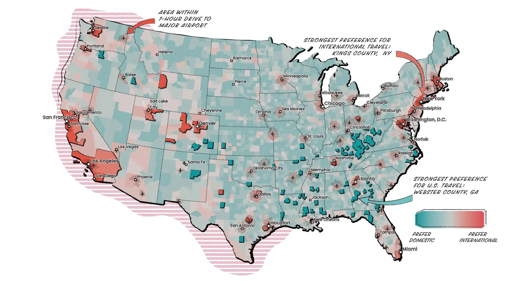 If you’re closer to an international airport, does that mean you prefer to travel abroad? This map suggests it has a significant impact. Counties in orange prefer international travel, while places that prefer domestic travel are in teal. In general, counties that strongly prefer international travel contain or are near international airports (one-hour commutes are shown as hashed polygons). Counties that most prefer domestic travel tend to be farther away, although some counties in Georgia and Kentucky are relatively close to international airports.