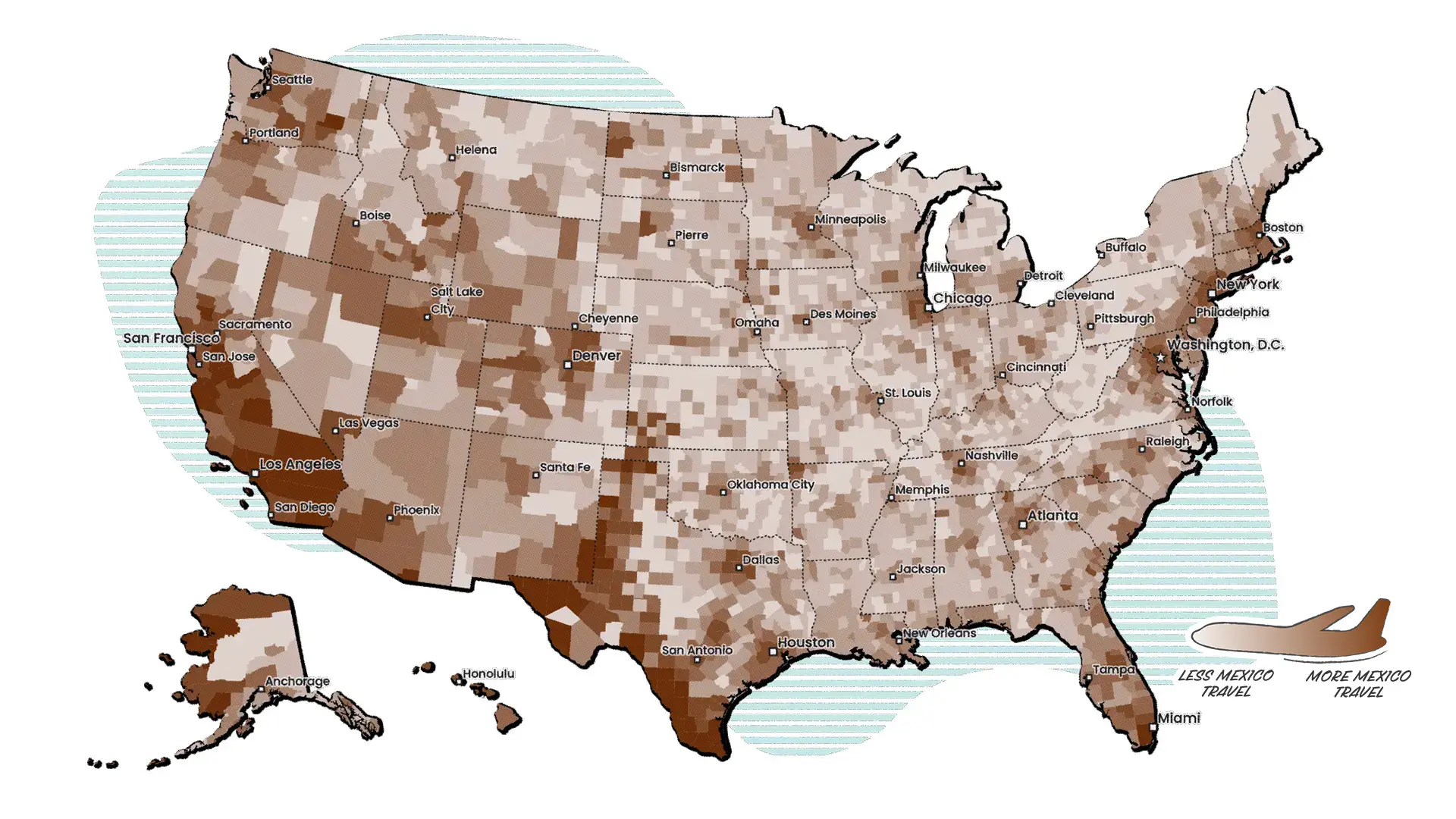 While we might assume that proximity to Mexico influences travel to Mexico, that’s not always the case. People in many counties along the southern US are more likely to travel to Mexico (represented in darker clay colors). Yet, there are several metropolitan counties in the northern US that also have a higher propensity for travel to Mexico. Some counties that are reliant on agriculture are also highlighted. Travel to Mexico appears to be driven by a mix of proximity and demographics.
