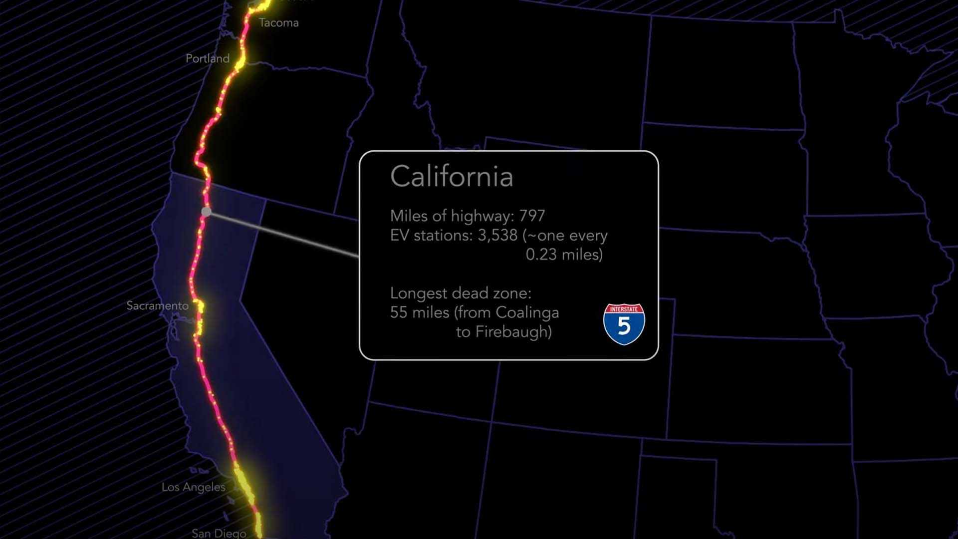 The map highlights EV charging stations near freeways to show the existing network. As the video plays, you can see the longest dead zone in each state along the highlighted road. It’s useful—and surprising. California leads all states with 13,658 charging stations but has two of the longest dead zones on the map.