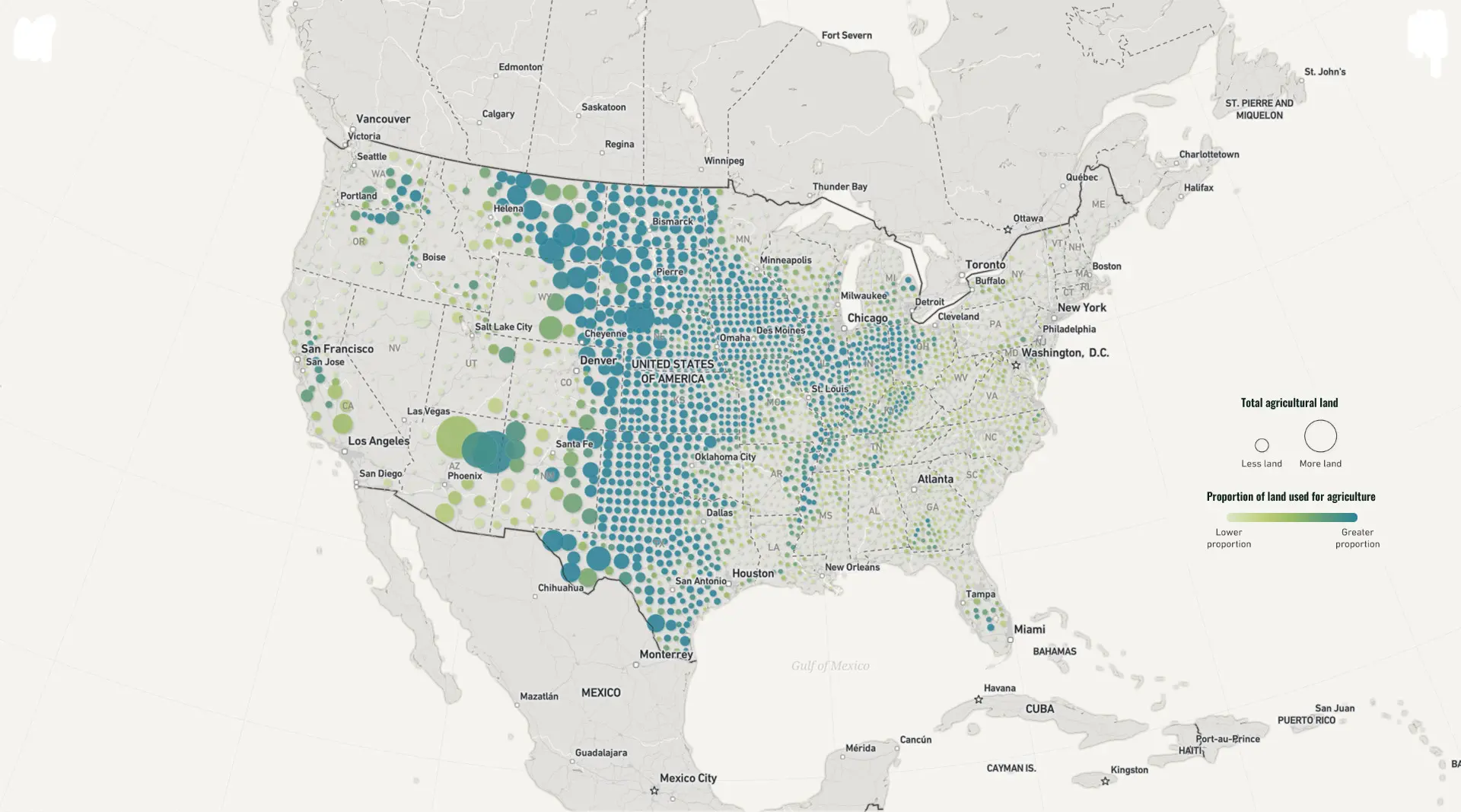 Every five years, the US Department of Agriculture publishes the Census of Agriculture. It chronicles agricultural revenues and acreages as well as the demographics of producers and the individual products they cultivate. This interactive narrative from Esri maps the data to explore different aspects of agriculture in the US. Below are some of the specific views that we found most interesting.