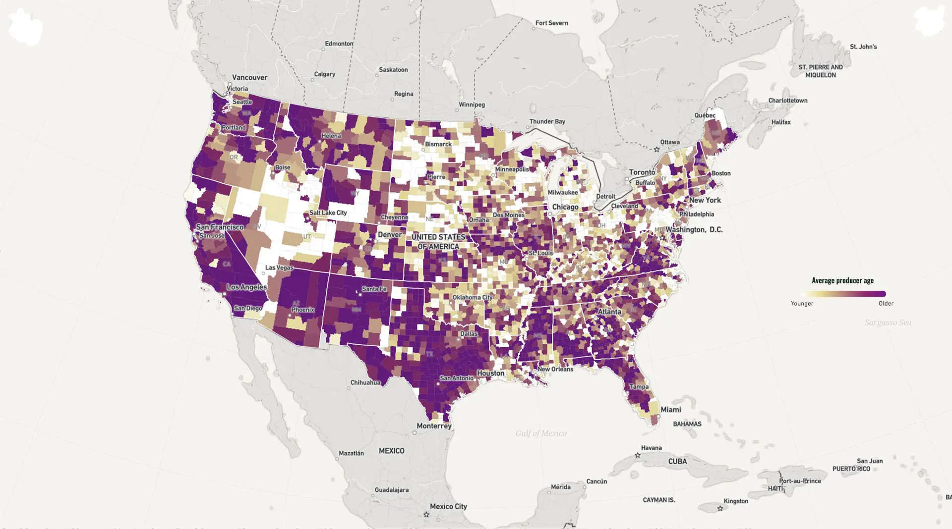 The average age of producers (defined as “a person who is involved in making decisions for the farm operation”) in the US is around 60 years old. In this map, counties in dark purple have an average producer age above 60. Places in white have the lowest average age. The youngest producers on average can be found in the Midwest, where farming operations are more often passed through families. States along the southern edge of the US tend to have, on average, older producers.