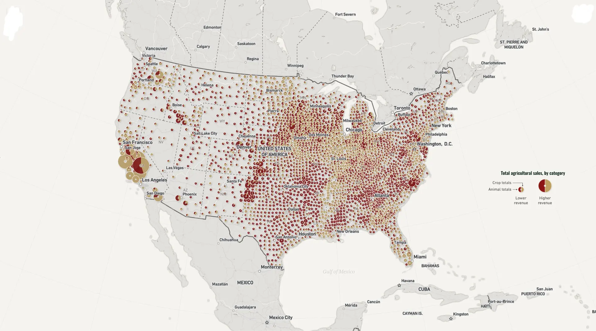 Crop sales and animal products make up an almost even split of total agricultural sales, with crops accounting for 52% of all revenues. Pie charts in this map show the breakdown between crop sales (beige) and animal products (red), with the size of the circle representing total agriculture sales. While animal products (including livestock, eggs, and milk) are more prevalent in the Southeast and Texas, the Midwest favors crops. In California, which accounts for 11% of all agricultural sales in the US, crops reign supreme.