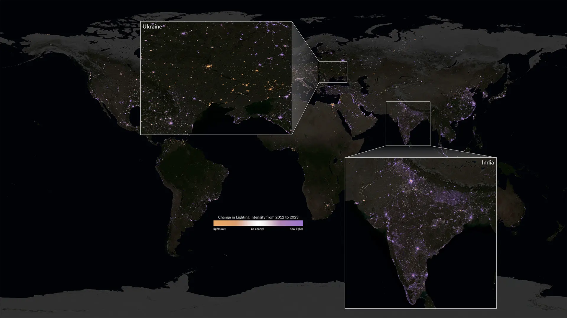 While the maps do not tell us why lights may increase or decrease, a closer look and additional context paints a clearer picture. Inset maps for India and Ukraine then replay both views of nighttime lights in greater detail. In India, you can see steady growth as a result of new infrastructure. In 2012, just 79.9 % of India’s population had access to electricity. By 2021, that figure had risen to 99.6%.