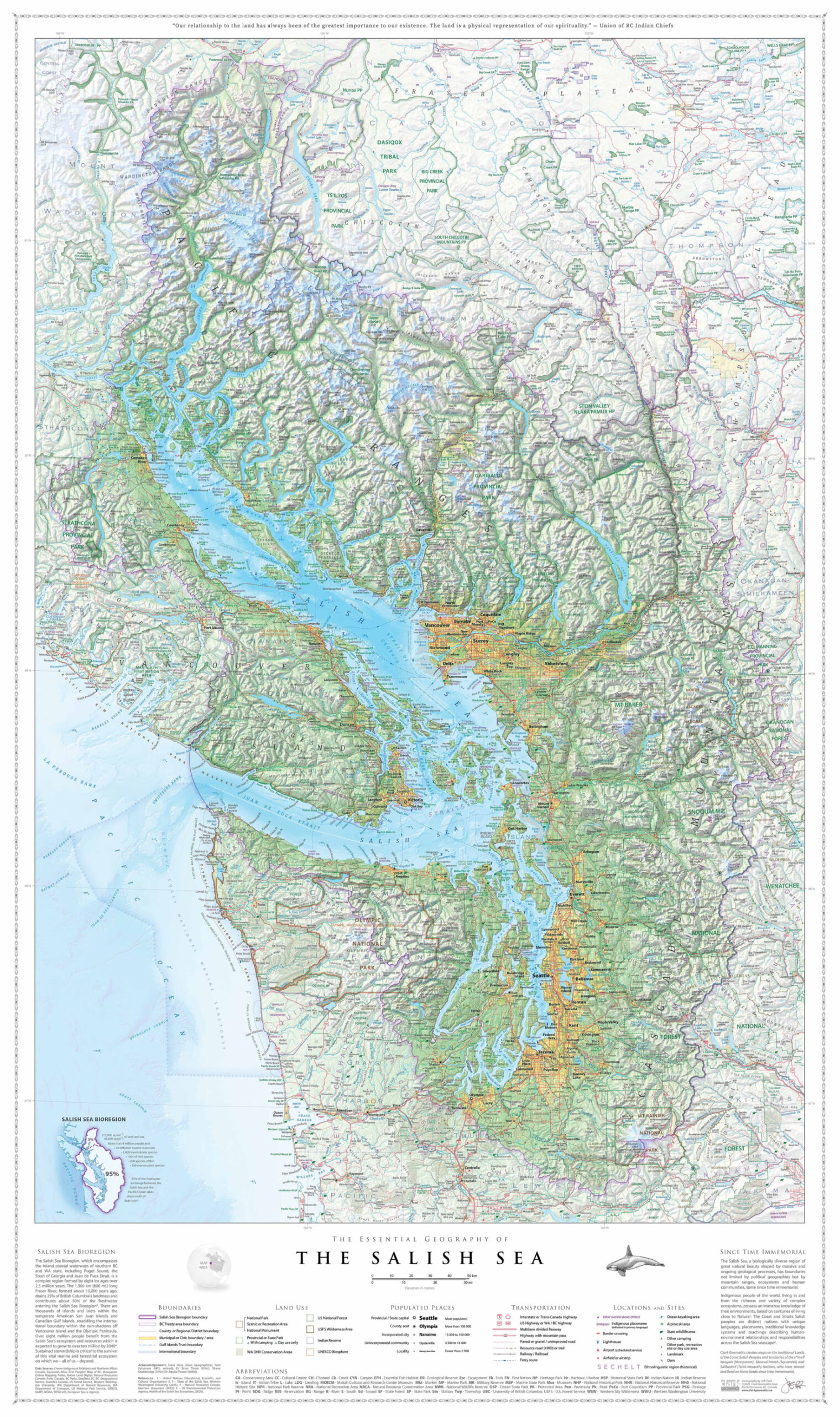 Mapping such a historied place is no small feat. And doing so while representing the range of geographic features of the region is a taller order still. Jeff Clark of Clark Geomatics handled the task brilliantly in his map, The Essential Geography of The Salish Sea. Expertly combining the natural and built environments, Clark’s map is more than a pretty picture. It is a lesson in both local history and the art of cartography. Weaving together First Nations history with the urban environment of airports, transportation networks, and state and provincial parks, the map invites readers to pore over its detailed features. And this is done with an expertly crafted design that reflects elements of the Swiss greats and popular maps in geographic magazines.