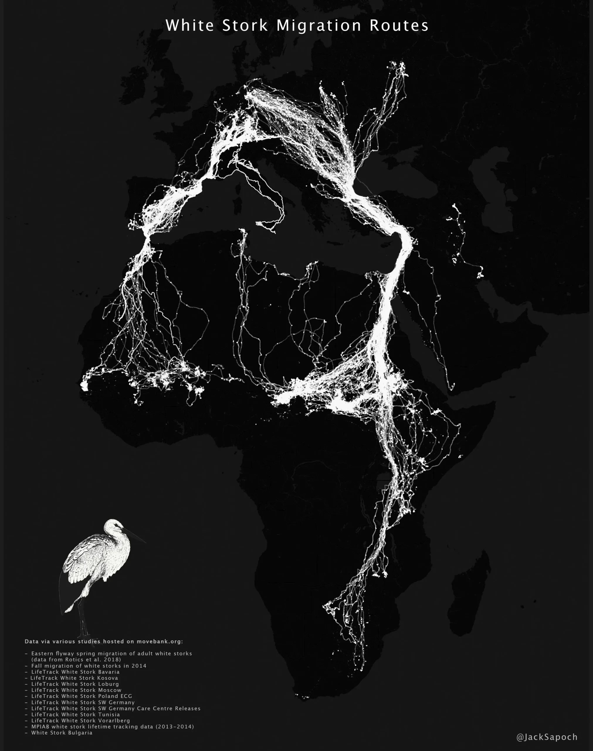 Boundaries aren’t included because they’re meaningless to storks. Contrast this with refugees, who often try to make similar journeys. Storks can move freely across these places as needed. But refugees often face peril and impediments from such boundaries. With this framing, the monochromatic map takes on a somber tone. In doing so, it retains its elegance. And remains just as powerful.