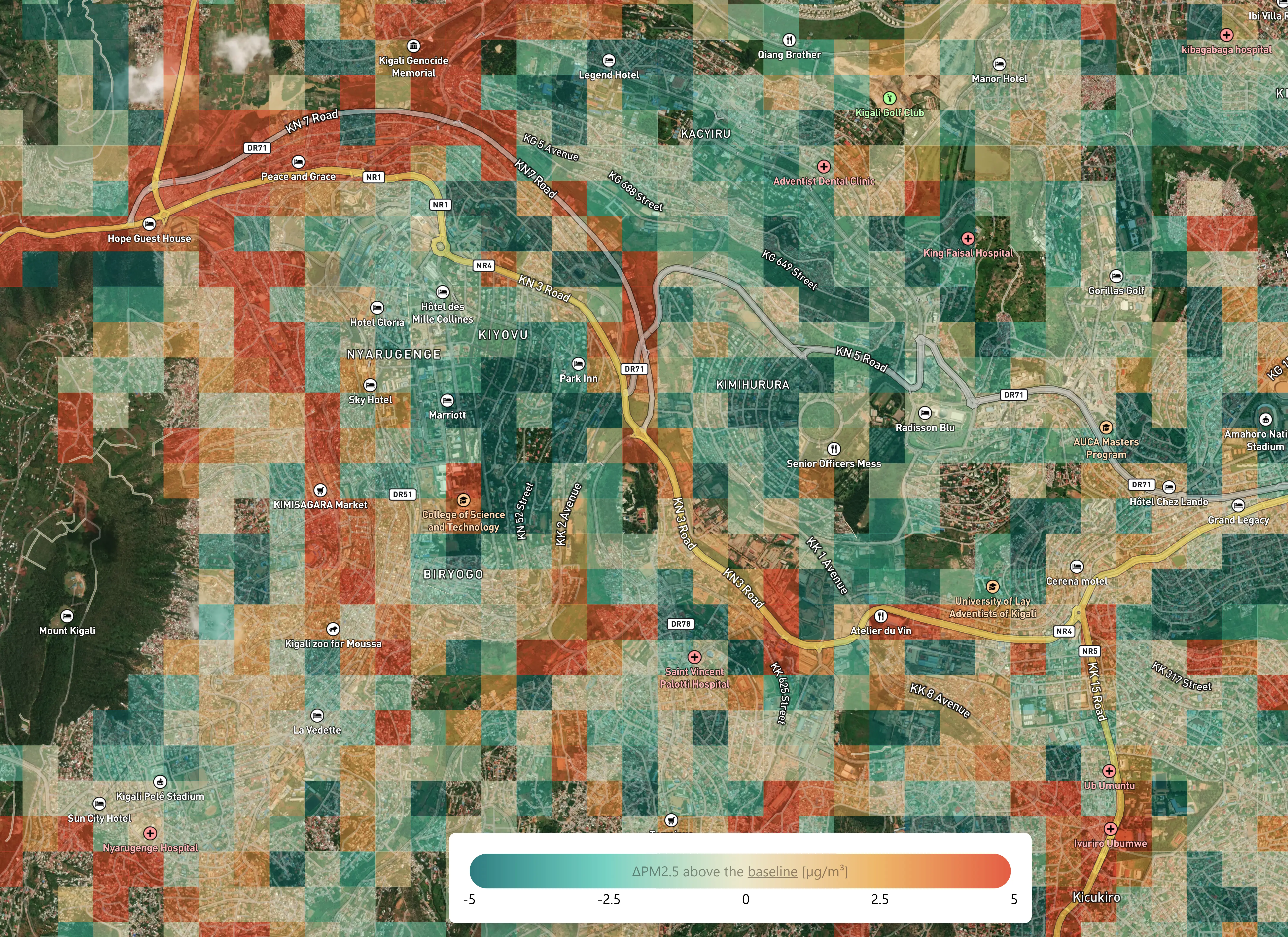 The map reveals how the city’s road network and other features influence air quality on a granular scale. But green cells do not necessarily signal good air quality. While these places show lower PM2.5 levels relative to the Kigali baseline, Kigali’s baseline is still too high. Overall, PM2.5 levels across Kigali range around 30 micrograms per cubic meter. This is well above the World Health Organization’s guideline of 5 micrograms per cubic meter.
