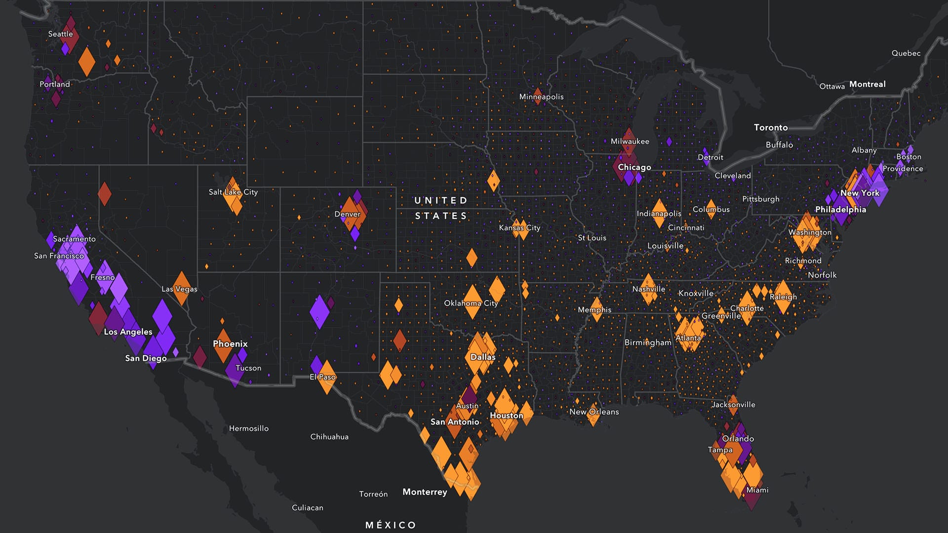 You can visualize these factors across the entire country. The map also includes bookmarks for four urban cities and four rural counties, so you can compare patterns. The results are surprising.