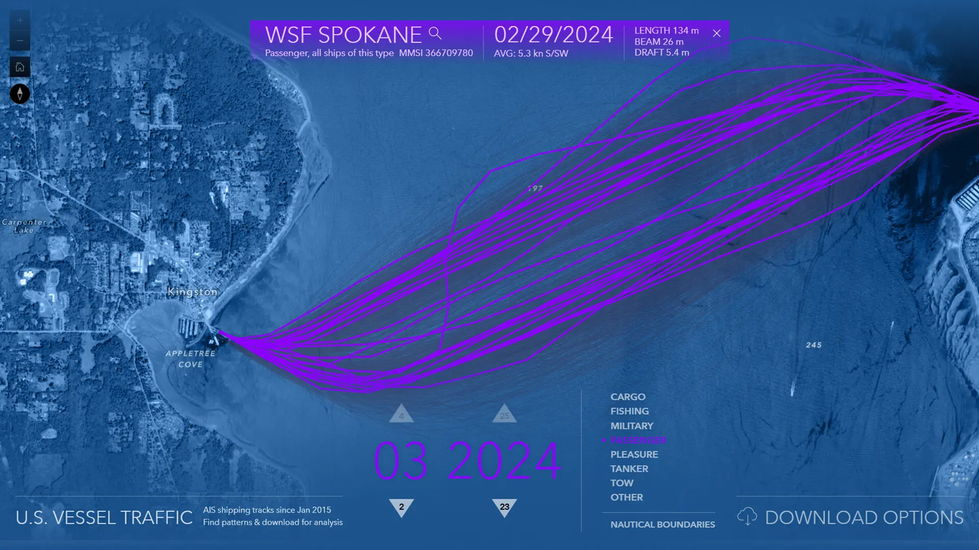 This interactive map from Esri provides a comprehensive view into vessel traffic in the US. It uses Automatic Identification System (AIS) data to show vessel tracks and types over time.
