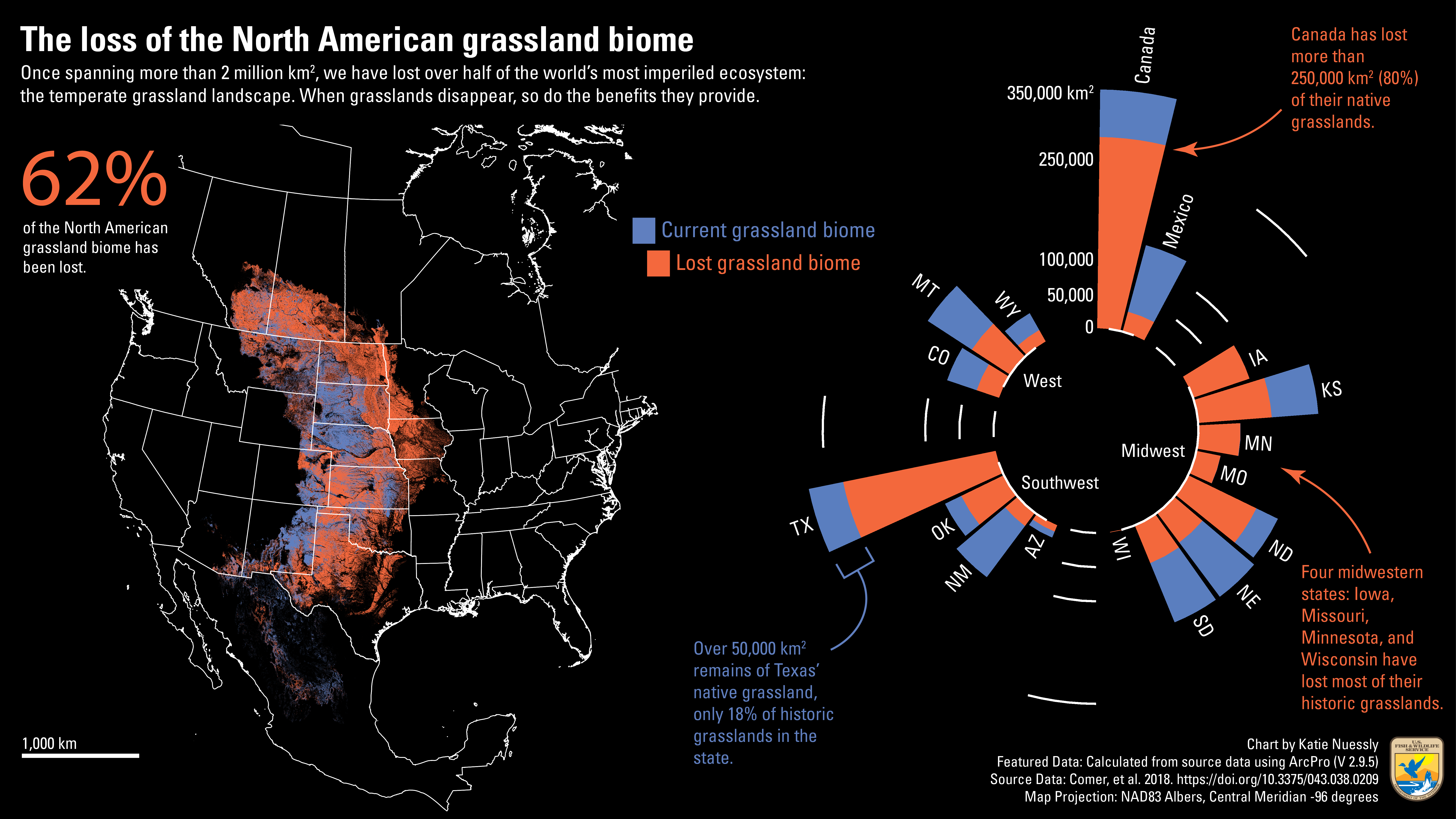 A circular stacked bar chart quantifies the acreage of grasslands in each state. Texas has lost more than 80% of its grasslands, with around 12.5 million acres remaining. Other states have seen less loss. New Mexico, Nebraska, South Dakota, and Montana still have significant shares of their historic grasslands.