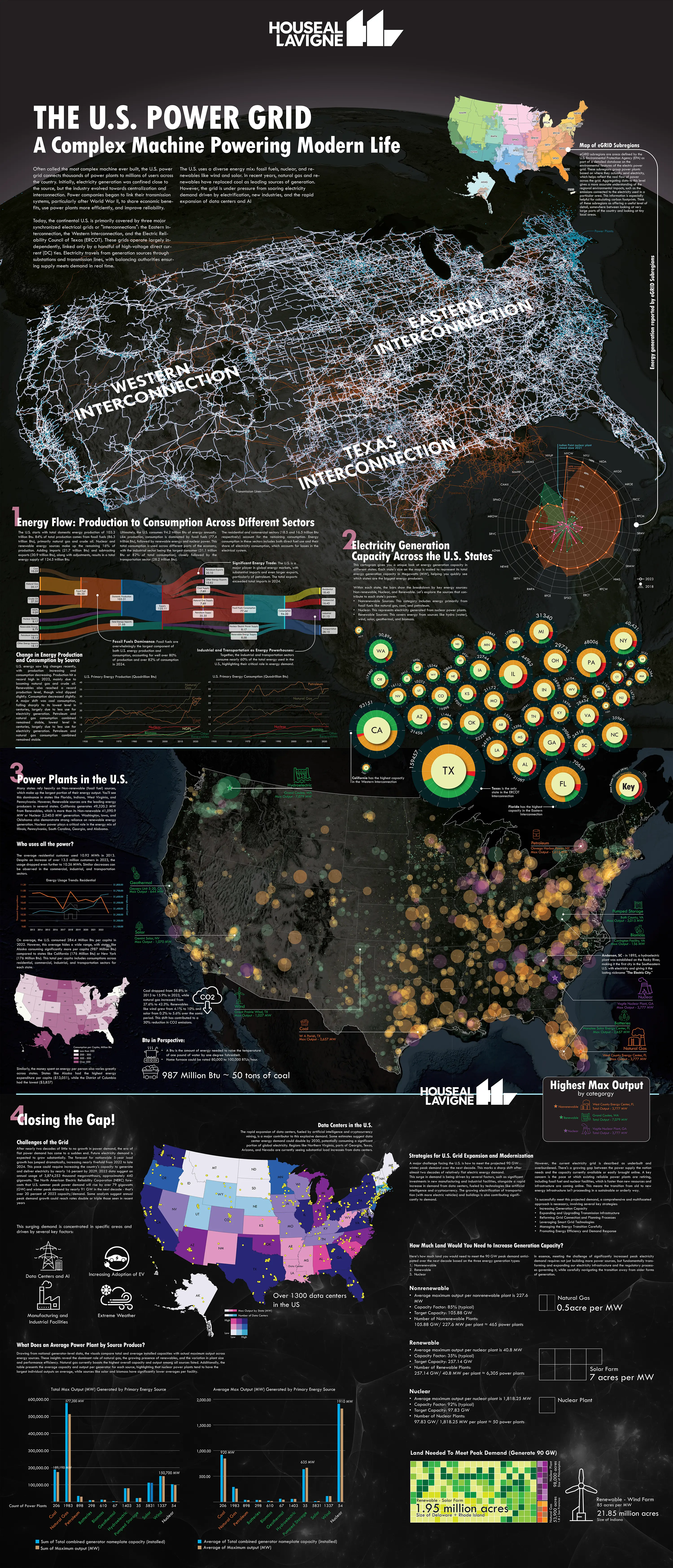 This poster from Houseal Lavigne highlights multiple dimensions of the US electrical grid through a collection of maps and charts. It uses data from federal sources, industry groups, and others to explore infrastructure networks, generation capacity by state, and more.