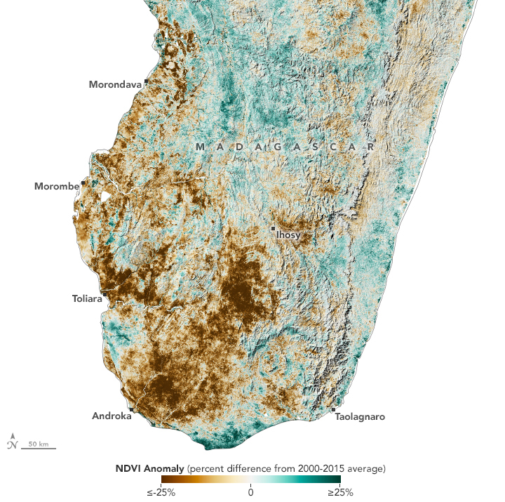 Another map from NASA Earth Observatory focuses on drought in Madagascar. In the southern half of the country, much of the vegetation is stressed by a lack of rain. Farmers already faced reduced maize yields, and these conditions put even more pressure on them.