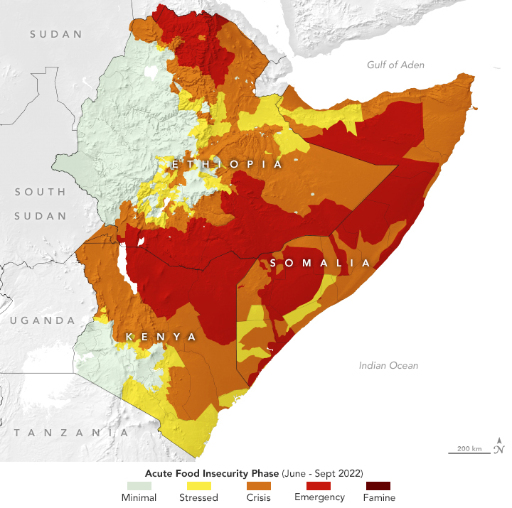 NASA Earth Observatory made this map of food insecurity across East Africa. Like the previous map, large areas of East Africa are affected. In Somalia, the entire country ranges from stressed to famine. While famine isn’t shown, the effects are still extreme, imperiling more than 500,000 children.