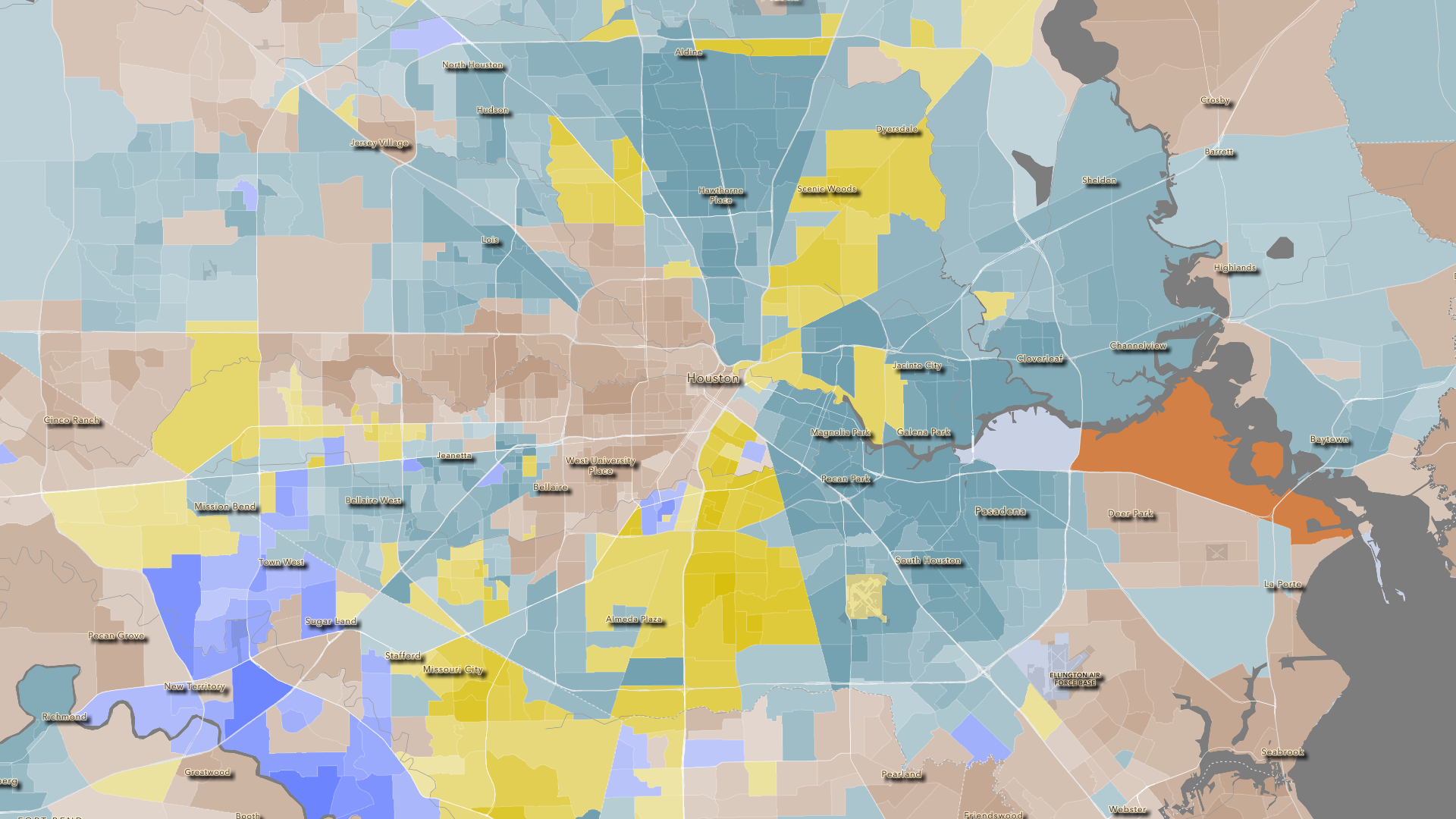 The map comes alive as you zoom in to census tracts and block groups. In urban areas like Houston, you can see a patchwork of different races and ethnicities across the city. The map includes bookmarks to let you quickly navigate to different cities. You can click any place for more information about the demographic makeup there.