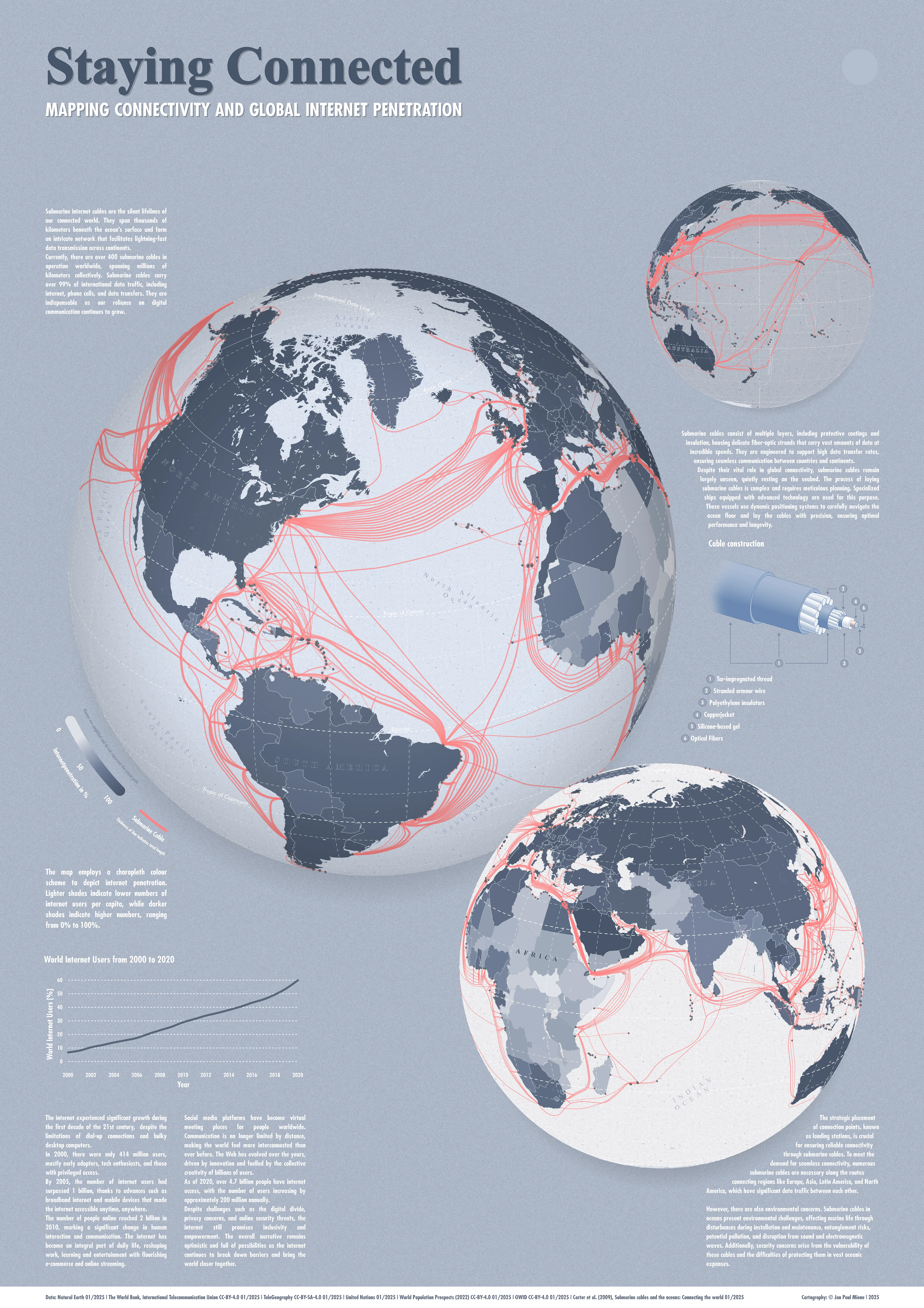 This map from geospatial analyst Jan Paul Miene highlights the global network of submarine cables that provide internet access. It relies on data from several sources to show the general path of these cables and internet penetration by country.