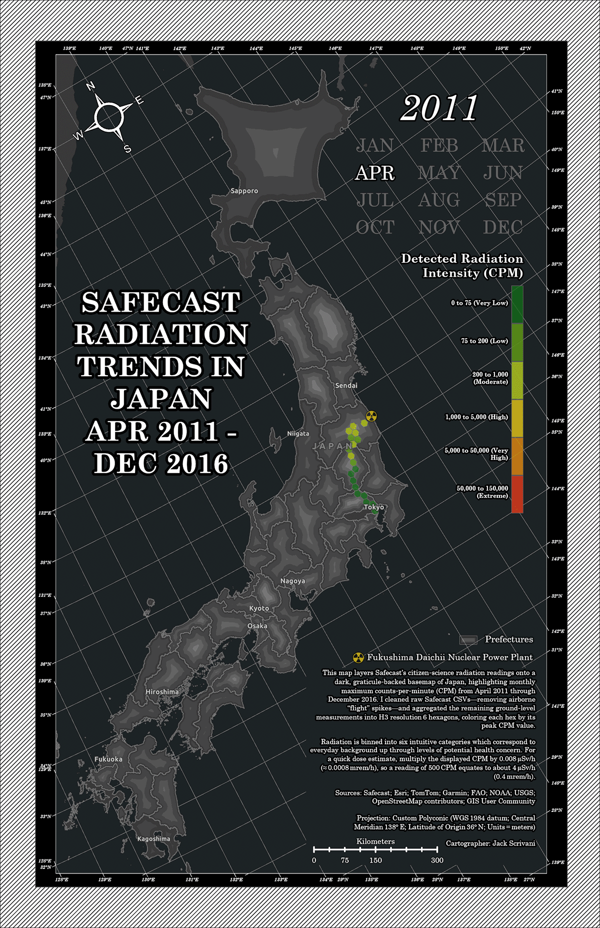 This animated map from cartographer Jack Scrivani tracks monthly radiation exposure throughout Japan. It uses crowdsourced measurements collected by Safecast from April 2011 to December 2016.