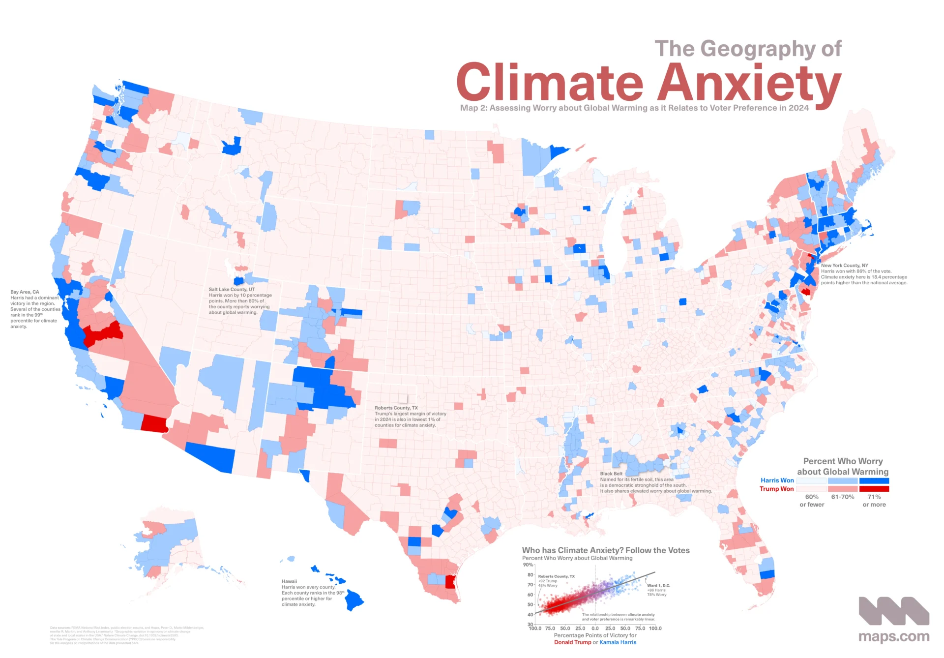 Counties, like those in California’s Bay Area, near New York City, and Salt Lake, voted highly in Kamala Harris’ favor. They also reported some of the highest levels of worry about global warming of all counties in the United States. More than 80 percent of respondents in these counties reported being ‘somewhat’ or ‘very’ worried about global warming. In contrast, Roberts County, Texas had the strongest preference for Donald Trump in the US with 92 percent of voters choosing the Republican. Yet fewer than half of Roberts County reported the same level of climate anxiety. The rest of the nation follows suit, with 77 percent of a county’s climate anxiety being explained by who they chose in the 2024 presidential election