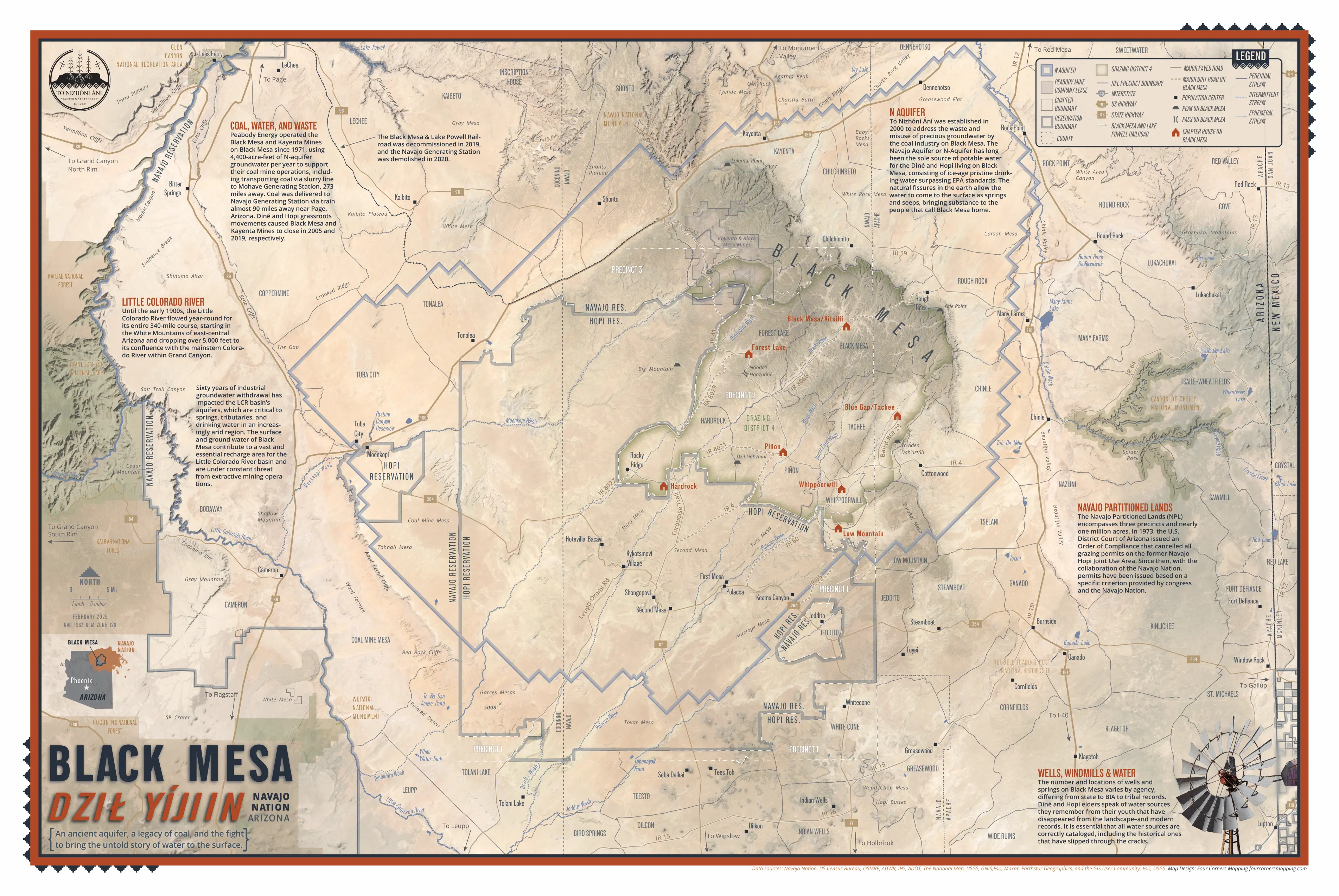 This gorgeous map from Anna Riling of Four Corners Mapping shows the vast Navajo Aquifer in northeastern Arizona. The map relies on a combination of Indigenous knowledge and government data to map water resources and Indigenous communities in a region known as Black Mesa, or Dził Yíjiin in Navajo.