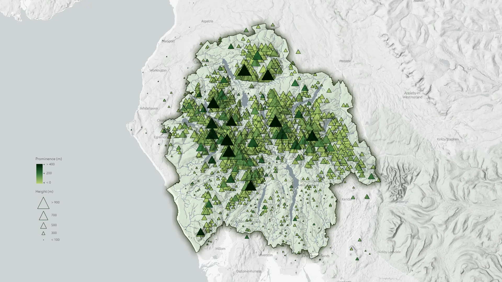 Each mountain, or fell, in the Lake District is unique. And thanks to Heather Smith, a cartographer with Esri, you can explore them in detail. Using the Database of British and Irish Hills, Smith created an interactive map of fells in the region. Each fell is shown using triangles that vary in size and color. The size of each triangle depicts the height of each mountain—larger symbols correspond to taller fells. The prominence, or the height of the fell’s peak relative to its closest low point, is shown in increasingly darker shades of green.