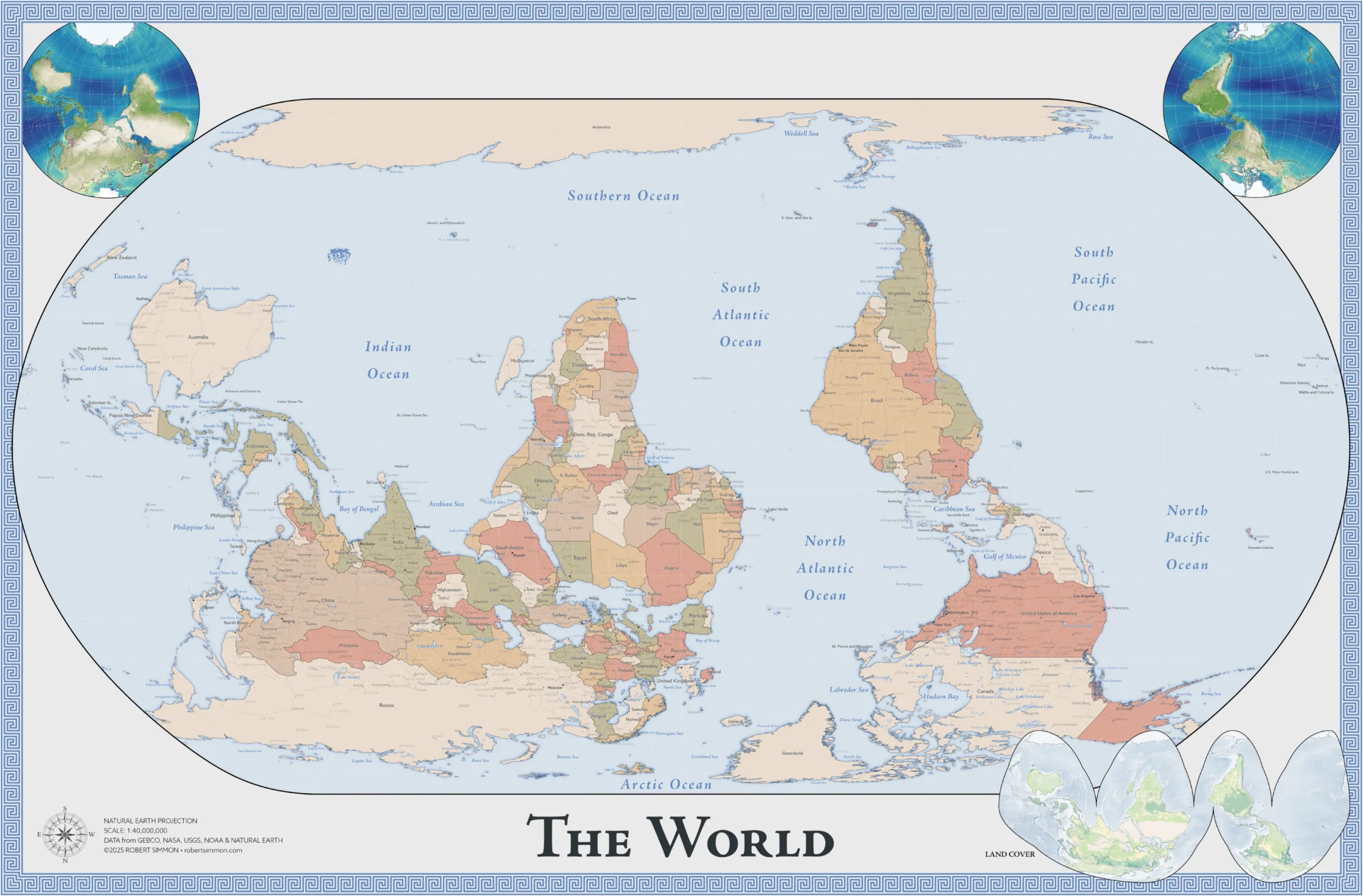 Simmon’s map includes countries, major lakes, oceans, gulfs, seas, roads, and cities. It also features inset maps depicting Earth’s biosphere, global land cover, and bathymetry. All of these are familiar to most map readers. Yet the map may seem disorienting to many. Simmon’s map is geographically correct, yet purposely—and literally—turns convention on its head. What was once familiar becomes alien, challenging readers to look at Earth anew. It also encourages us to think more deeply about such conventions: Why is north almost always at the top of maps? And must it always be that way? Simmon’s map reminds us that it doesn’t have to be.