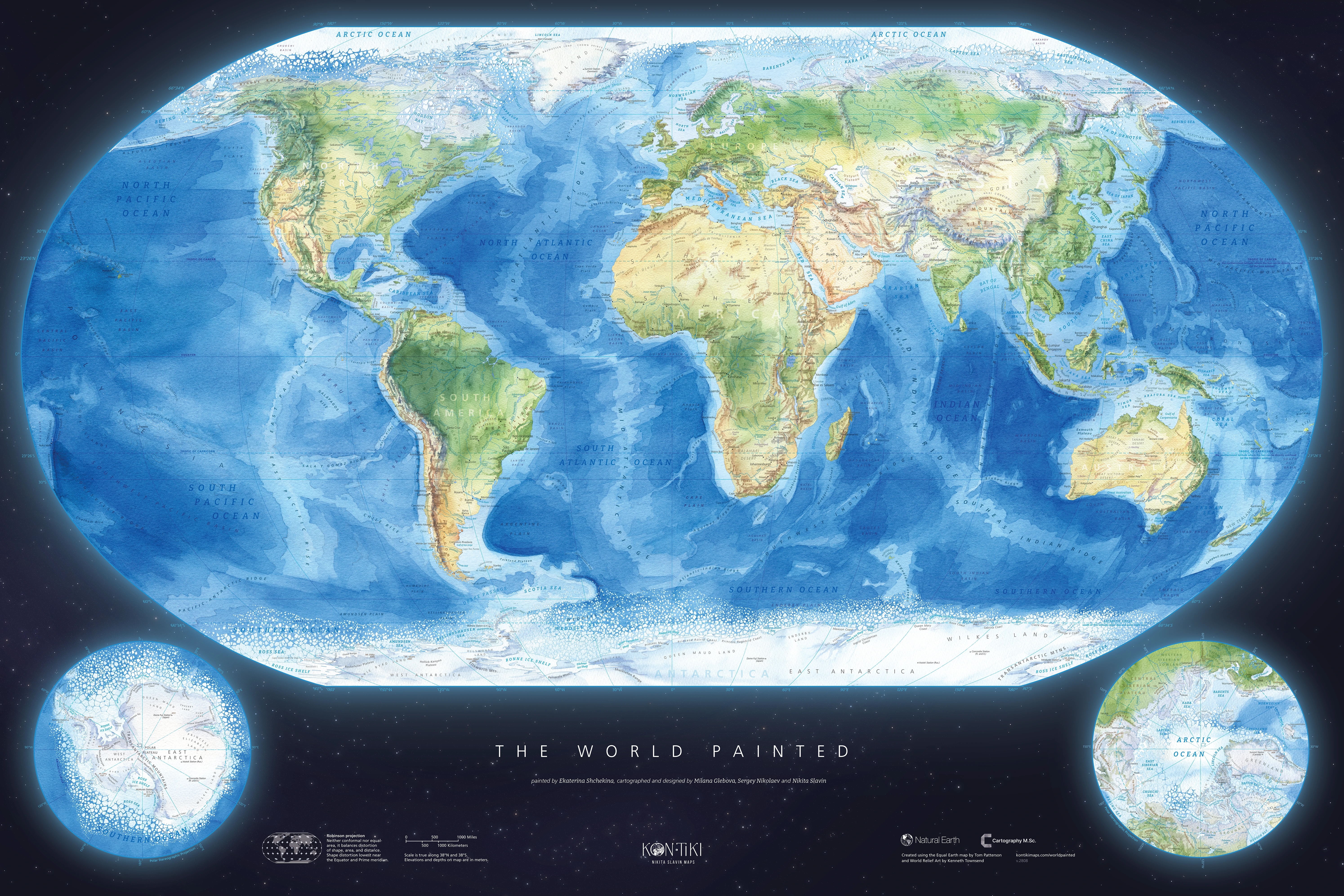 This exquisite map from the Kon-Tiki Maps team does exactly that. It fuses hand-painted watercolors and computer graphics to create a stunning map of our planet that is based on data from Natural Earth.