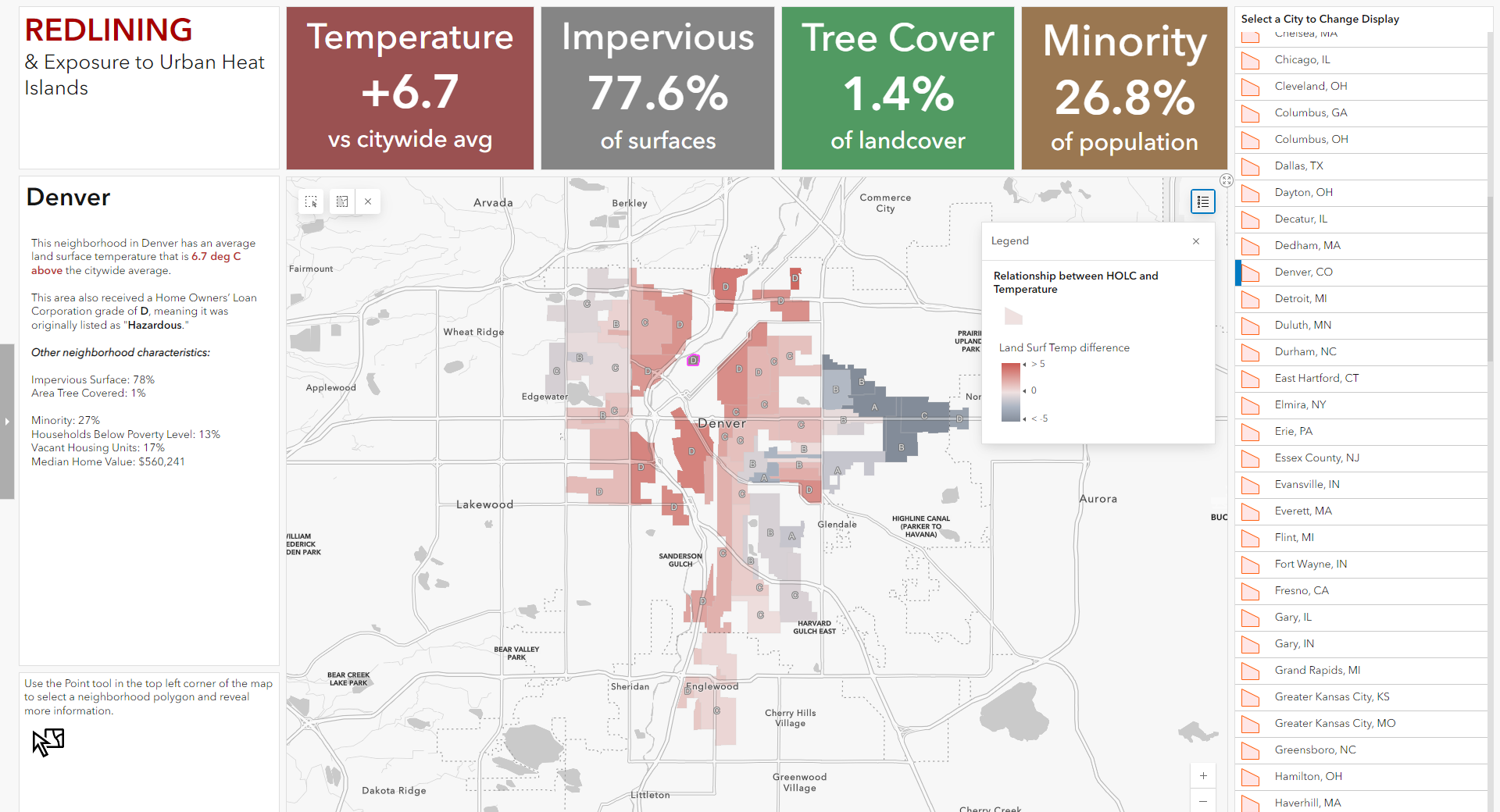 The dashboard includes more data to show the present-day impacts of redlining. You can explore tree cover (which reduces heat) and impervious surfaces (which reflect heat) for each neighborhood. You can also learn more about home values, vacancy rates, and demographics. Taken together, it becomes clear how these 80-year-old ratings from the HOLC still impact communities today. Places with A ratings tend to have lower temperatures, more green space, and higher home values than those with a D rating.